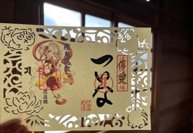 ついなちゃんのキャラクター前鬼・後鬼、ウリ坊、寺紋を切り絵で仕上げた御朱印です。