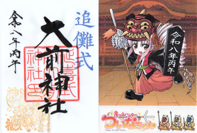 ついなちゃんと三鬼の判子が捺された大前神社節分祭御朱印についなちゃんの節分祭デザイン和紙がついています。