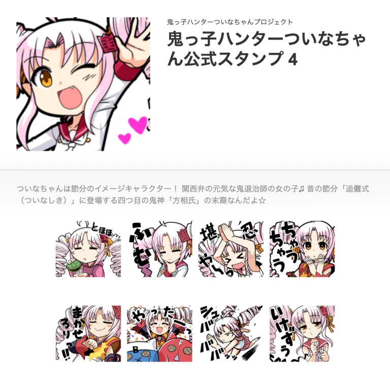 ※上記リンクからアクセス、またはLINEスタンプ検索で「鬼っ子ハンターついなちゃん」で検索